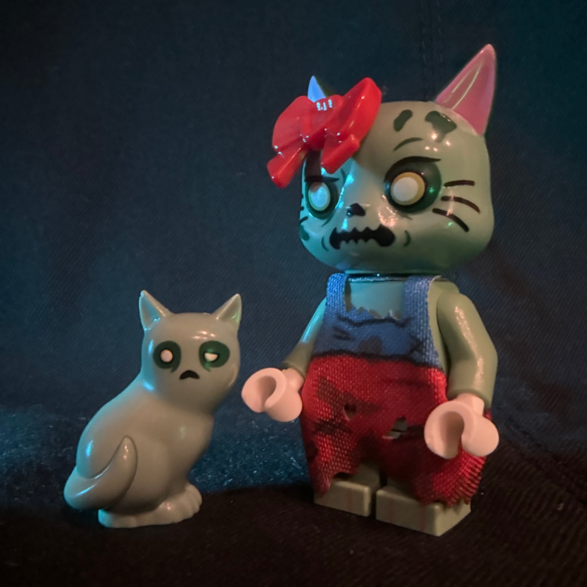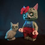 From beyond the studded grave rises Goodbye Kitty. Stitched together with a pastel rotted bow and a skeletal grin, she shuffles through the graveyard with her loyal sidekick, a tiny undead kitten who purrs in spectral green, proving that even in the afterlife, friendship (and fashion accessories) never die.